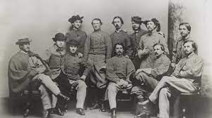 We have two depictions of guerillas in action, including the famous Lawrence, Kansas Raid. A photo of a live guerilla shows the flamboyant and individualized nature of the war. Notice also he has two pistols. The famous death photo of Bloody Bill Anderson shows the kind of shirts we talked about in the episode. A photo John S Mosby as well as another including some of his officers. Notice the contrast between his Partisan Rangers and the Guerillas.