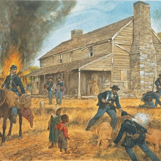 Here we have a photo of George Pickett and one of Jim Lane as well as a depiction of the naval action at New Bern. Then we have a depiction of the Meridian Campaign, a photo of William T Sherman, and a map of the campaign.